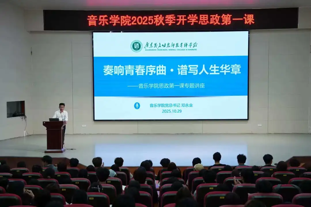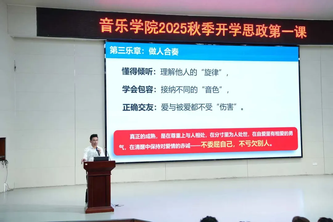 10月29日,音乐学院党总支书记以“师兄”与“师长”的双重身份,为全体新生讲授“奏响青春序曲 谱写生命华章”的思政第一课。